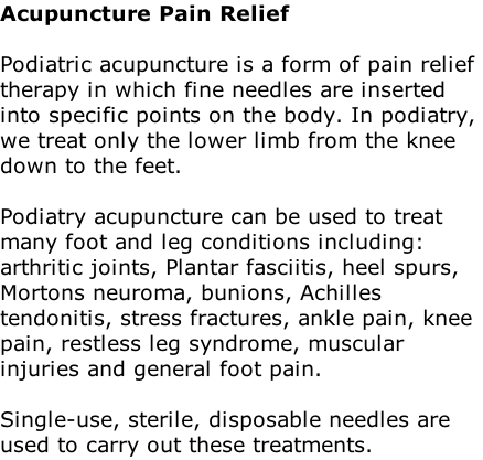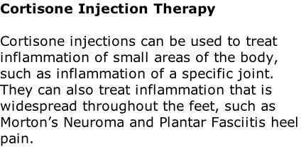 Cortisone Injection Therapy for the treatment of various foot conditions including Plantar Fasciitis, Heel Pain, Morton’s Neuroma, Painful Bunions and Ankle Pain.